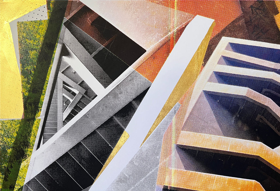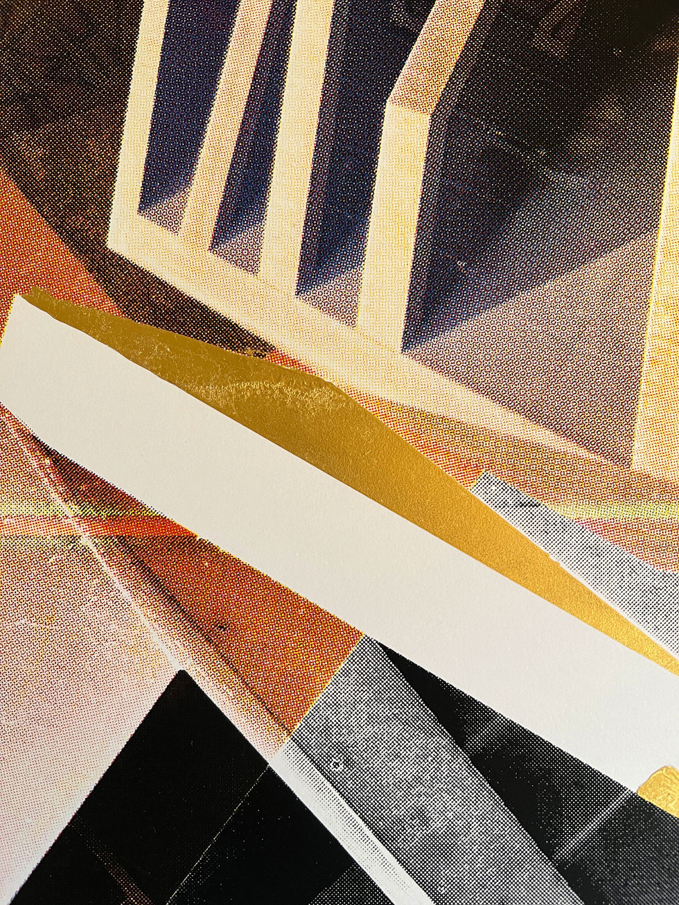 Der Druck besteht aus einer, von mir designten Collage, in einem 4 Lagen CMYK Druck. An mehreren Stellen habe ich mit 23 Karat Blattgold gearbeitet.