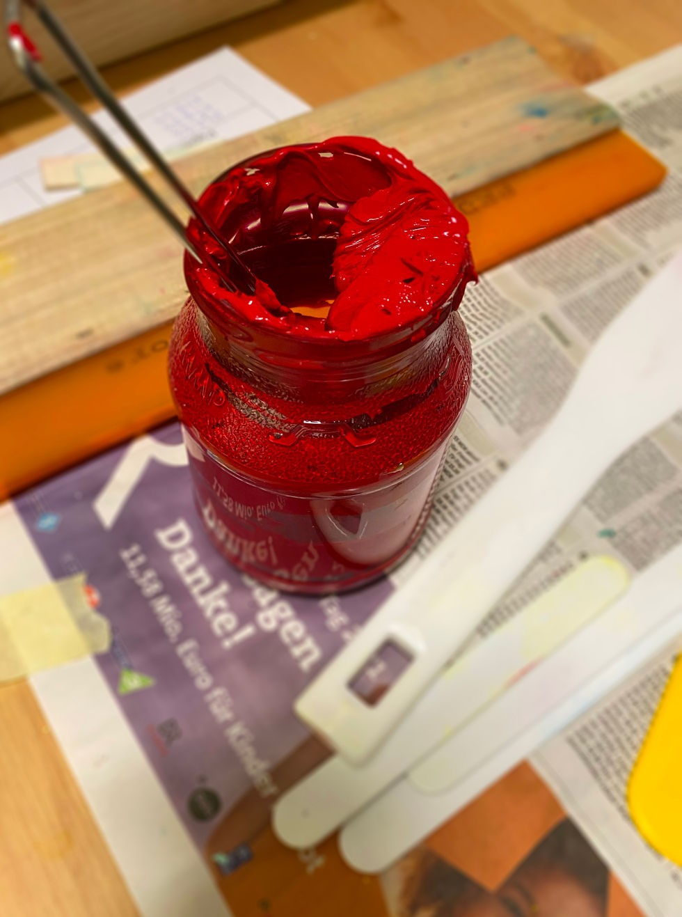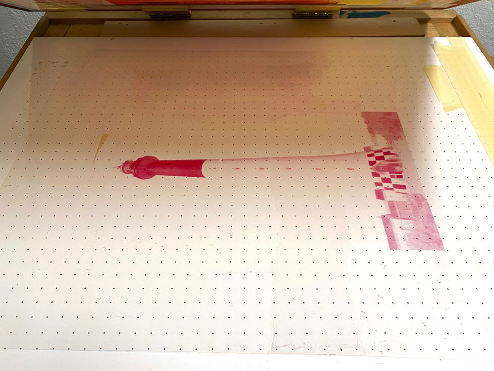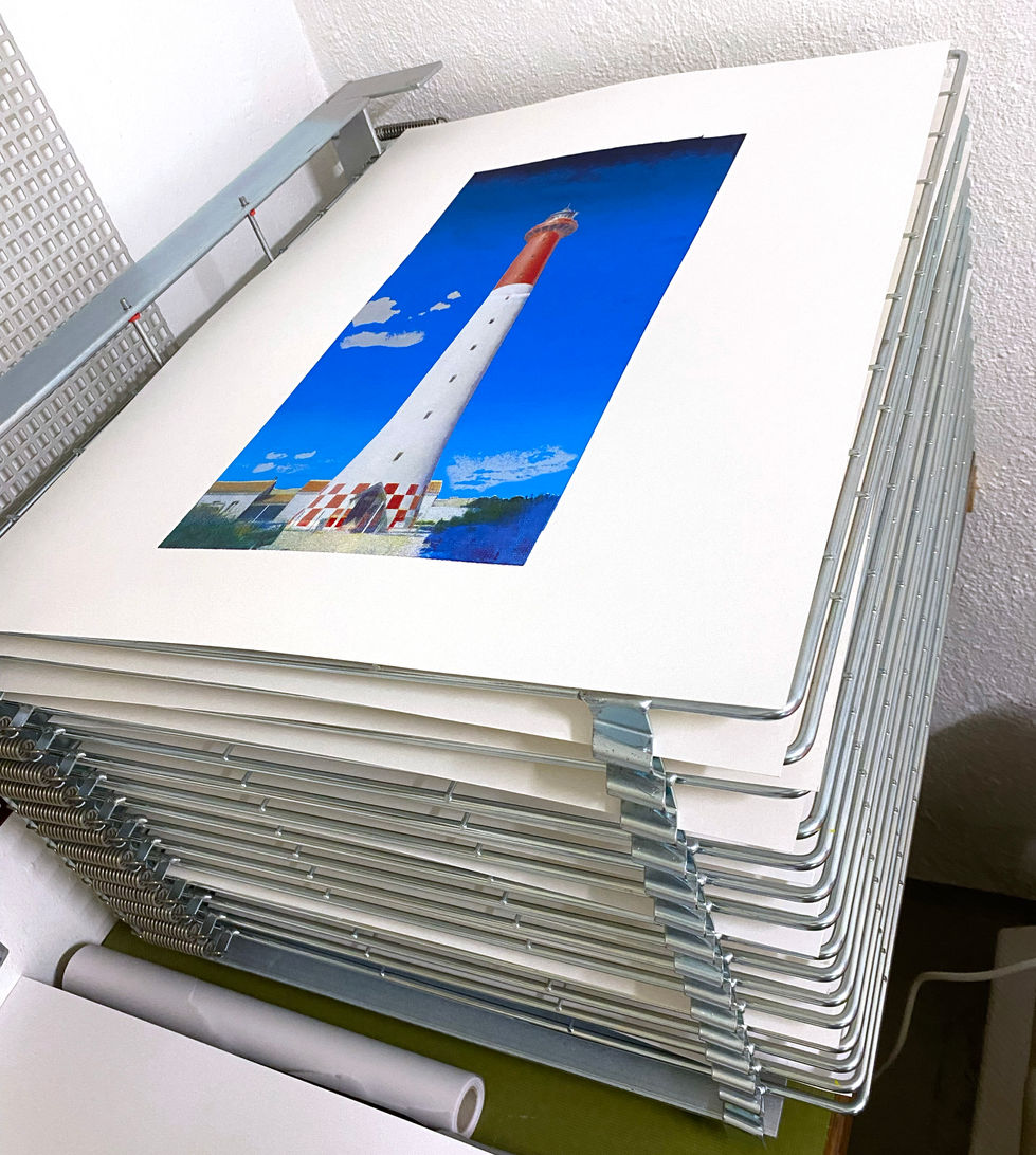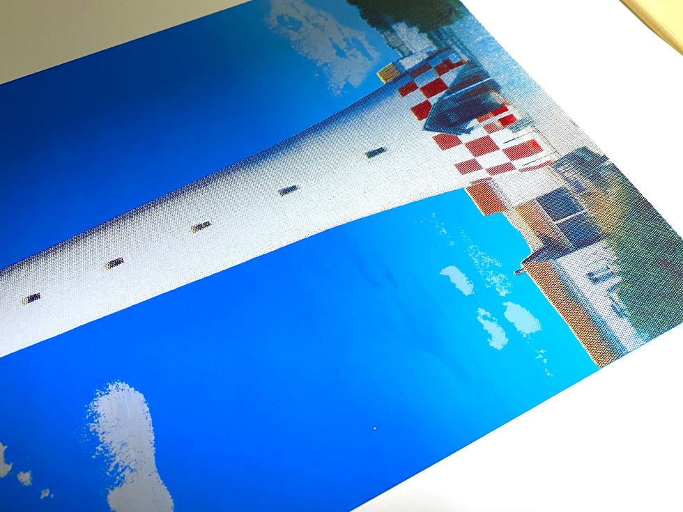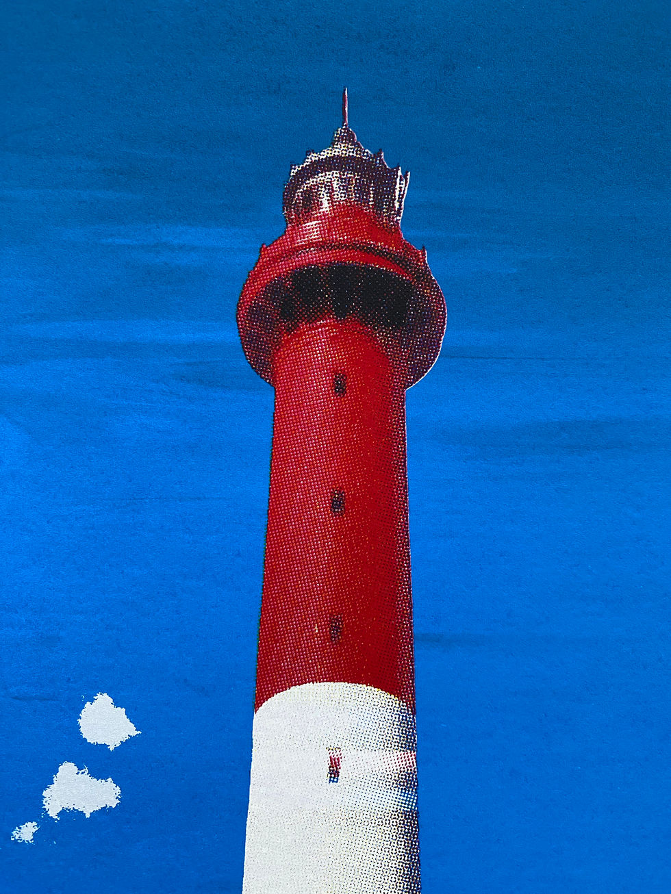 Der Druck besteht aus einer ineinander verlaufenden Hintergrundfläche, den darauf gedruckten Wolkenformationen und dem Leuchtturm im 4 Lagen CMYK Druck.